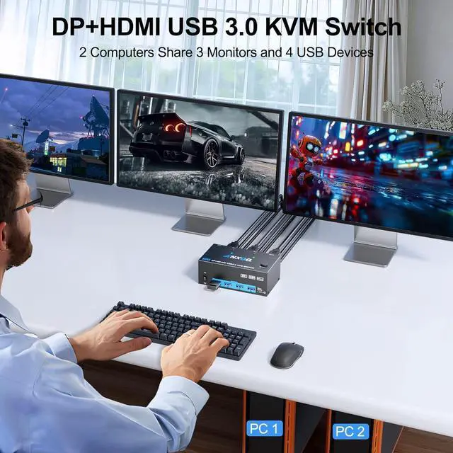 Displayport + HDMI KVM Switch for 2 ComputersThis KVM Switches allows 2 computers to share 3 monitors and 4 USB devices. Save space, money, and effort. 3 Monitor KVM allows a single set of equipment to meet all needs.