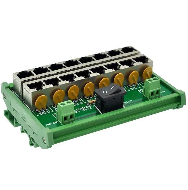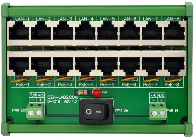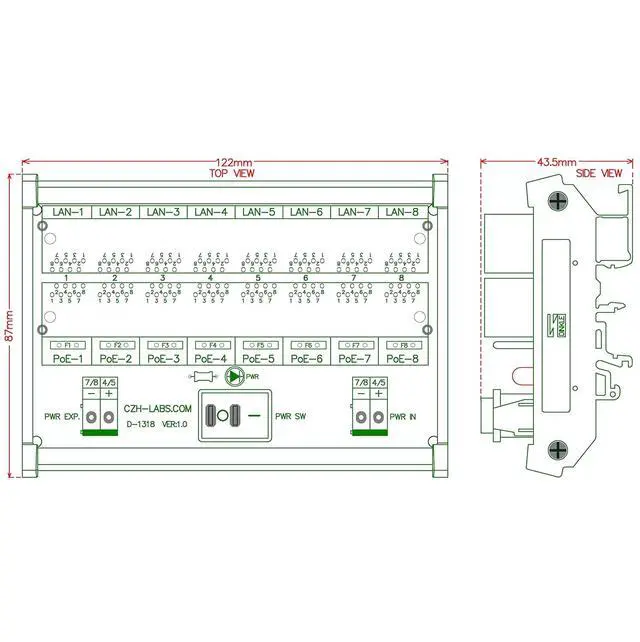 Specifications: Terminal Block Power Input: 12VDC - 60VDC, maximum current 10Amp; Termianl Block Expansion Output: maximum current 10Amp; LIN-X Input: RJ45 1 / 2 / 3 / 6 pins(data), 4 / 5 / 7 / 8 pins not connected; PoE-X Output: RJ45 1 / 2 / 3 / 6 pins(data). 4 / 5 pins power +, 7 / 8 pins power -; Data Rate: 10 / 100Mbps; PoE Power Output Maximum Current(per channel): 720mA.