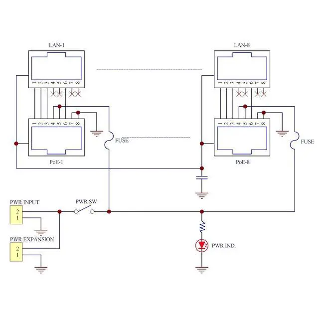 Power Input terminal block for all PoE power supply, each port serial a recoverable fuse(fuse value 1.1Amp / 72V). Power Expansion Output terminal block can connect power supply to next device.