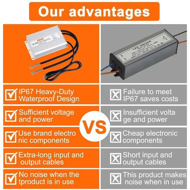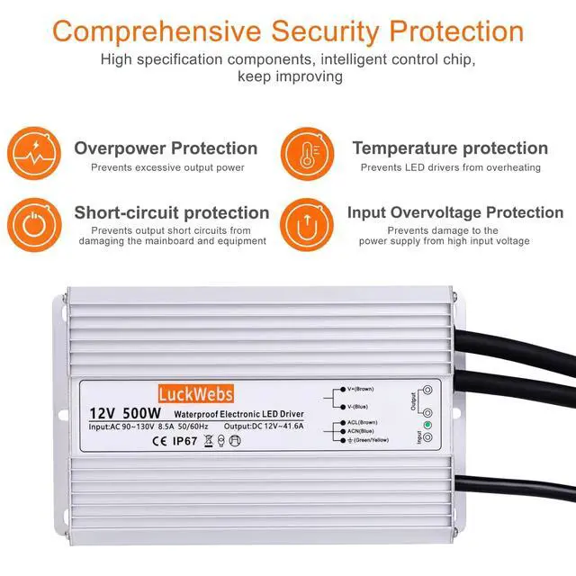 Applications: This 12V 500W waterproof LED power supply is compatible with a variety of lighting devices, including LED strips, LED landscape lights, LED underwater lights, LED street lights, LED wall washer lights, LED garden lights, digital products, LCD monitors, security monitoring systems, etc.