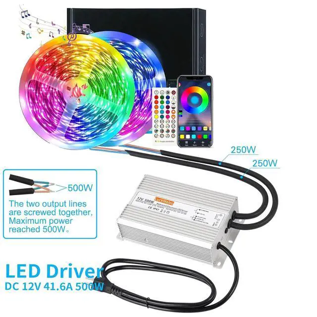 12V 500W LED driver. Input voltage: AC 90-130V, 50-60Hz; Output power: DC 12V 500W. Power efficiency up to 90%. Power supply dimensions: 8.07 inches (L) x 4.72 inches (W) x 2.2 inches (H). Our team also adopted a newly designed system that completely eliminates noise issues during operation.
