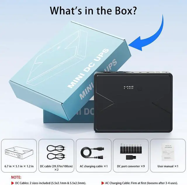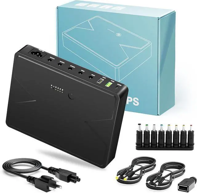 Portable Mini UPS: The package includes 9 different-sized connectors, 1 US AC adapter, and 2 DC cables (39.37 inches/100 cm),the 2DC cables is different cable specifications. This makes small ups battery backup compatible with your equipment. It is small and easy to carry. It weighs 0.46 kg and measures 6.57 x 4.92 x 1.18 inches. It backs up routers and modems and quickly charges many types of devices, including tablets, cell phones, routers, cameras, PCs, and desktops. You can use it as a mobile power source to get power on the go.