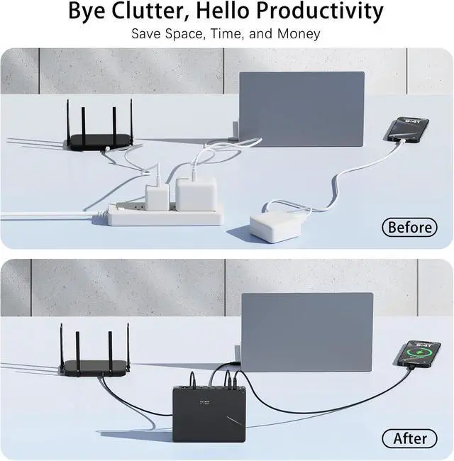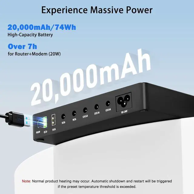 High-Capacity Battery: The ups power supply battery backup does not come with a separate lithium-ion battery. It has a built-in 20,000 mAh, 75 Wh battery pack that allows the device to run silently for up to seven hours with the push of a power button. This means mini ups for wifi router provides long-lasting power to keep your device running for extended periods.