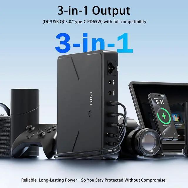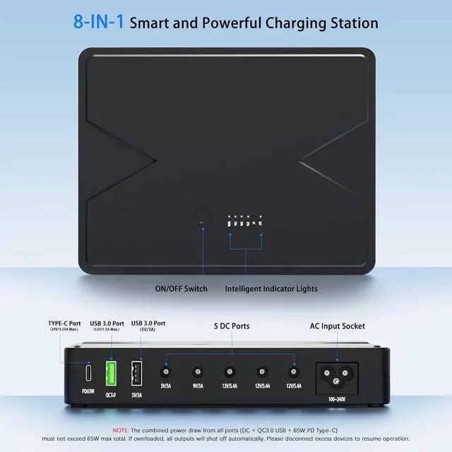 Multiple Output Ports: The 65W UPS backup battery features an aluminum alloy casing and supports multi-device power supply with eight output ports. 5 DC ports provide 5V/3A, 9V/3A, or 12V/5.4A; 1 USB port provides 5V/2A; and 1 USB QC3.0 port provides 5V/3A, 9V/2A, or 12V/1.5A. 1 Type-C port provides 5V/3A, 9V/3A, 12V/3A, or 20V/3.25A. PD65W port provides 5V/3A, 9V/3A, 12V/3A, 15V/3A, and 20V/3.25A. 5V/3A is available when using both the USB QC3.0 port and the Type-C PD65W port. Please make sure your device meets these power supply specifications.