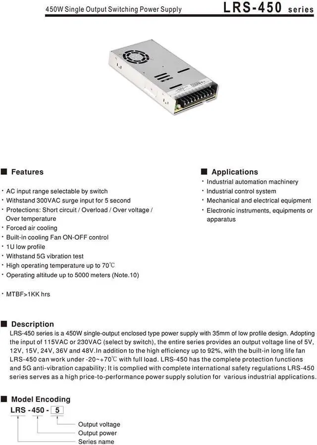 Protections: Short circuit / Overload / Over voltage /Over temperature Forced air cooling Built-in cooling Fan ON-OFF control 1U low profile Withstand 5G vibration test