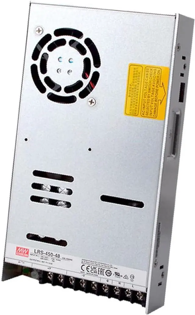 The LRS-450 series by features robust 450W power supplies that deliver high performance and reliability. Designed with metal enclosures for excellent heat dissipation and equipped with internal DC fans, these units ensure effective cooling and continual operation at temperatures up to 70°C. Each model can withstand 5G vibration and operate up to 5000 meters altitude, making them perfect for challenging industrial environments. With multiple certifications including UL and TUV, and protections against short circuit, overloading, and over-temperature, the LRS-450 is suitable for various applications such as industrial automation, control systems, and electrical devices.