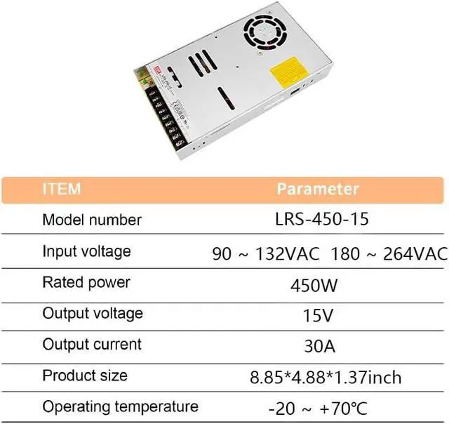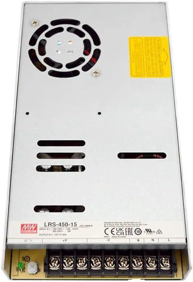 Certified Durable Power: UL, TUV approved LRS-450-15 delivers a stable 15V, 30A (450W) output. Ideal for demanding industrial applications, this power supply meets rigorous safety and performance requirements.