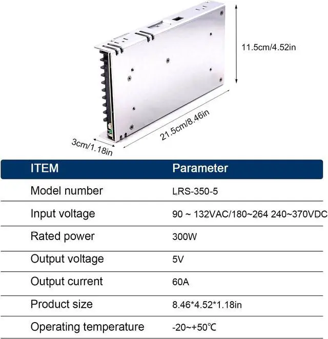 High Efficiency and Built-in Cooling: As a high-efficiency industrial power supply (up to 83.5% efficiency), it effectively reduces energy waste. The built-in cooling fan ensures a stable 5V 60A 300W output even under full load