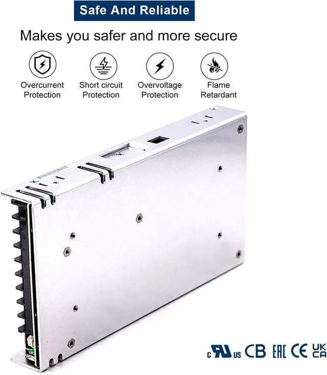Wide Input Voltage and Dual Certification: This LRS-350-5 switching power supply supports a wide input voltage range of 90-264VAC/240-370VDC. It is UL certified, meeting global market access requirements