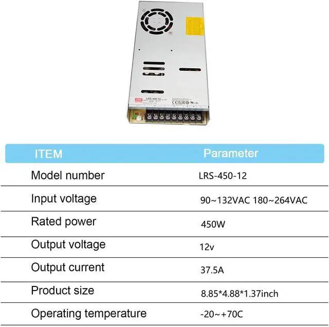 Cost-Effective SolutionManufactured by the original brand and backed by a 3-year warranty, the LRS-450-12 serves as a reliable, durable, and highly cost-effective power solution for applications such as industrial automation, mechanical control, testing equipment, and LED lighting