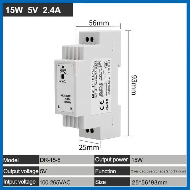 12V 24V Switching Power Supply Rail Type Small Volume DR-15-0.63A 1.25A 5V 15V 15w(5V 2.4A)