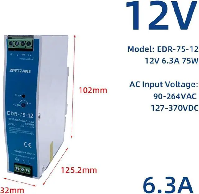 1PCS EDR-75W 120W 150W Single Output Industrial AC To DC DIN Rail Switching Power Supply 24v 12 Volt Adapter(EDR-75-12)