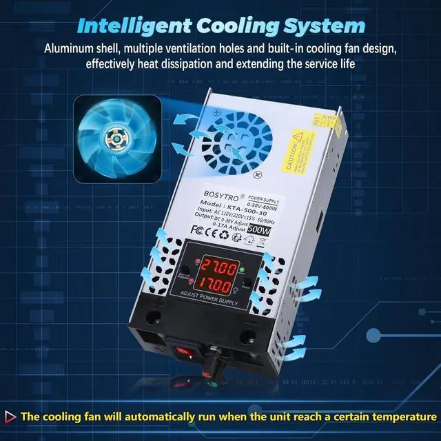 Adjustable Power SupplyThis ac to dc converter compatible with AC 110V/230V input voltage (manual switching), support output voltage range 0-30v and output current range 0-17A, suitable for 5V 9V 12V 24v 30v devices, max adjust voltage up to 30V; used for 1A 2A 3A 5A 8A 10A 12.5A 17A devices, max adjust current up to 17A, max output power 500W, Conversion efficiency 85%