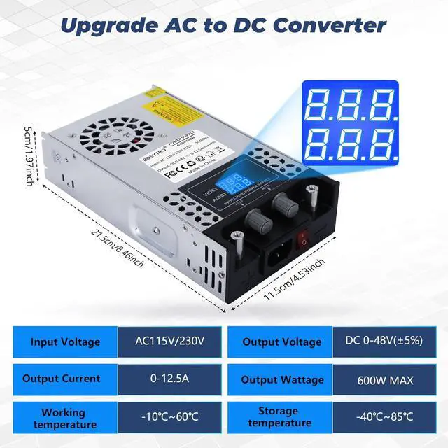Wide ApplicationThis 60v dc power supply widely used in industrial equipment, RV, radio/car stereos, Camper, led strip, cctv, computer project, 3d printer, motor pump, security camera, lcd monitor, lab computer and more device within 60 volt