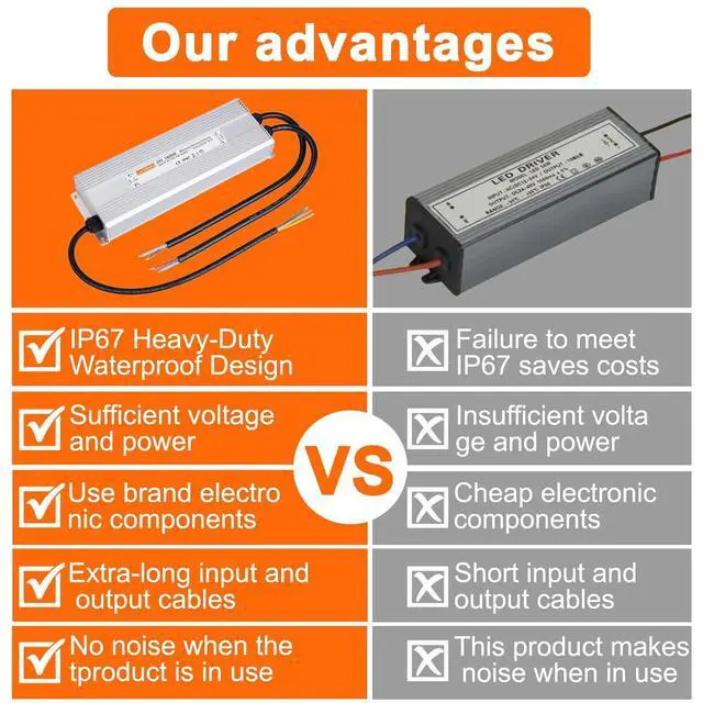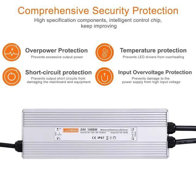 Precision quality: This 24V 1600W waterproof transformer has an IP67 protection rating. It features high efficiency and low temperature rise characteristics. It also boasts impact resistance, corrosion resistance, and high temperature resistance