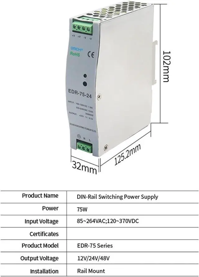 • 1PCS DIN-Rail 75W Switching Power Supply EDR-75 Ac Switching Adapter Input 12v 24V 48V Single Output Industrial Switch