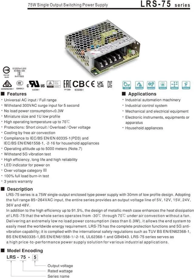 LRS-75 Series LRS-75-24 Switching Power Supply 220 to DC 36V/48V15V Lighting RS