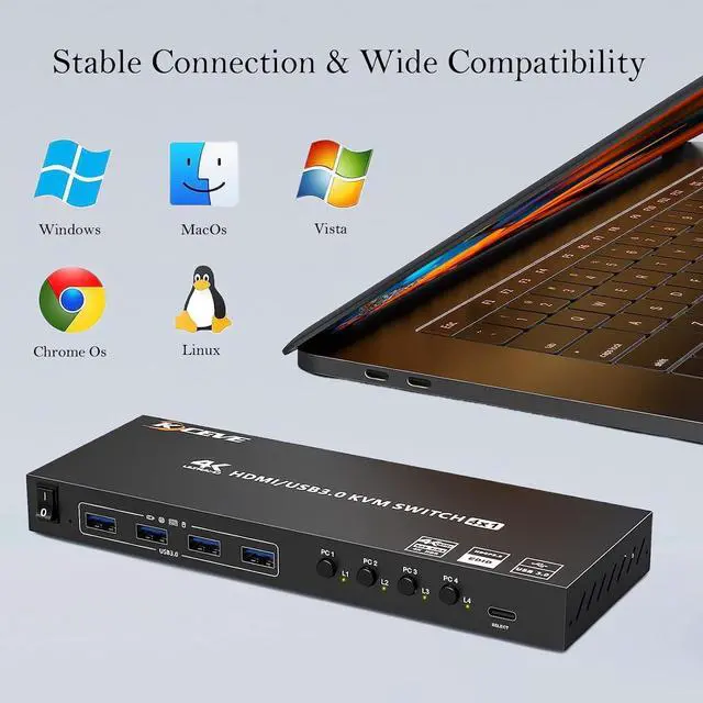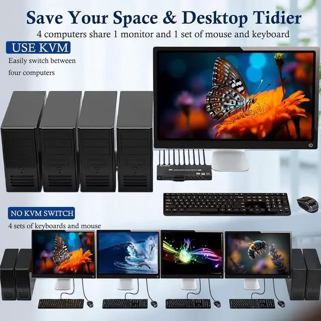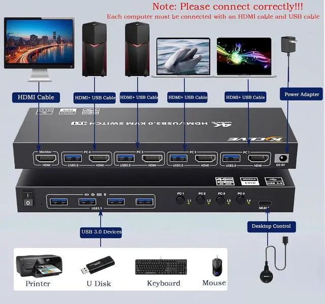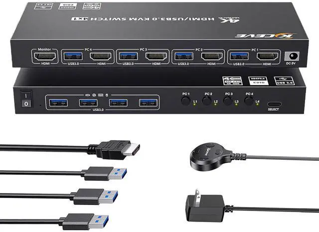 HDMI KVM Switch 1 Monitors 4 Computers Support Simulation EDID 4 Computers Share 1 Monitors and 4 USB3.0 Devices KVM with 4 USB 3.0 Ports 4K HD Resolution