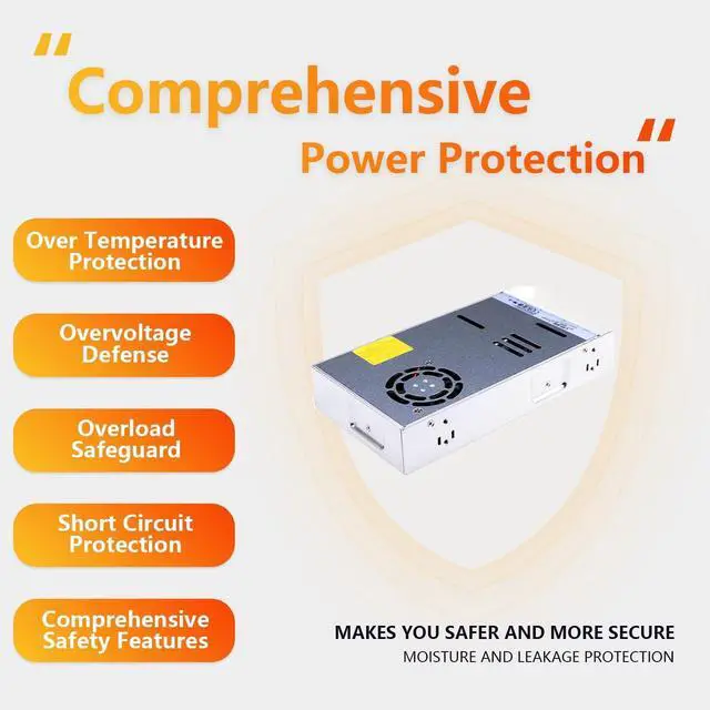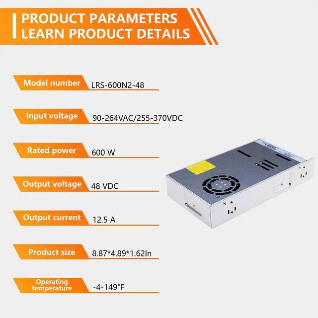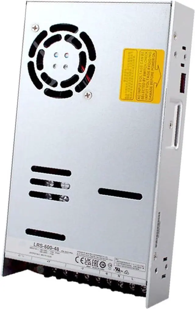 The SBJ LRS-600N2-48 is a high-performance 600W AC-DC switching power supply engineered for industrial applications, offering reliable power conversion with advanced features to meet the demands of modern automation and control systems. Key specifications include a single output of 48V DC with a rated current of 12.5A and an adjustable voltage range of 45.6-52.8V, ensuring precise power delivery. Input options cover 90-264VAC or 255-370VDC, selectable via a switch for easy adaptation to different power sources. Efficiency reaches up to 92%, reducing operational costs and energy consumption. Protection mechanisms are comprehensive, featuring safeguards against short-circuit, overload, overvoltage, and over-temperature, while compliance with international safety standards IEC/BS EN/EN61558-1 and 62368-1, including overvoltage category III, ensures safe operation. Durability is enhanced through the ability to withstand 5G vibration, operate in temperatures from -20°C to +65°C, and function at altitudes up to 2000 meters. A built-in DC fan provides forced air cooling with on/off control for optimal thermal management. The unit also supports 200% peak power for motor and inductive/capacitive loads during startup. Dimensions are compact at 8.87 x 4.89 x 1.62 inches with a weight of 2.09 pounds, facilitating easy installation in confined spaces. Applications span industrial automation machinery, industrial control systems, mechanical and electrical equipment, and electronic instruments requiring stable power. In summary, the SBJ LRS-600N2-48 delivers a cost-effective, reliable solution for diverse industrial needs, backed by a 3-year coverage period for added assurance.