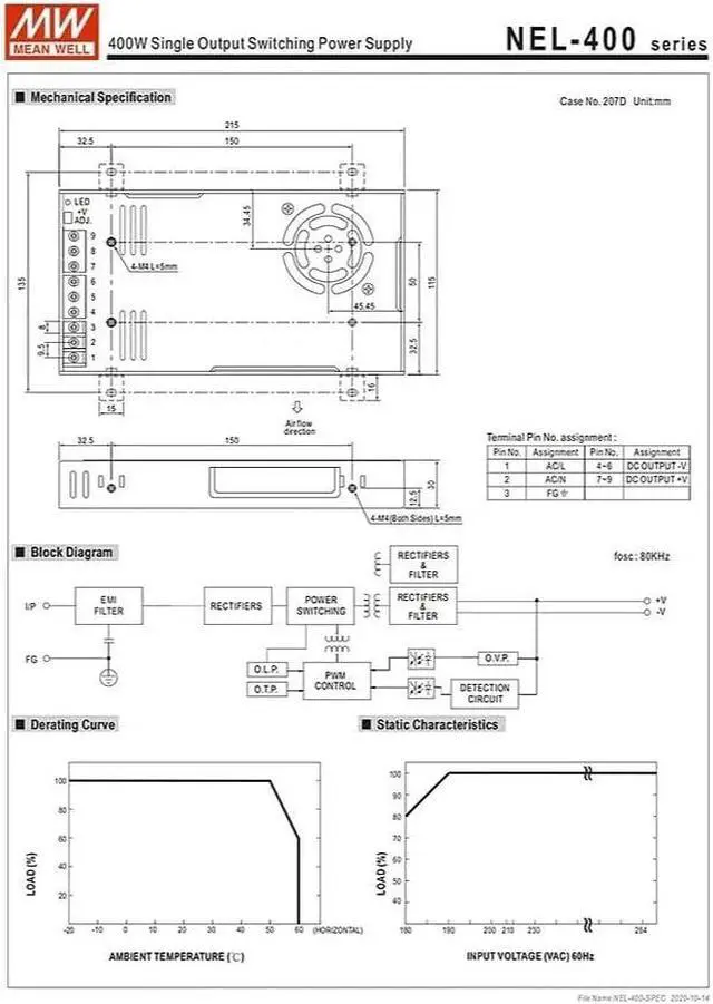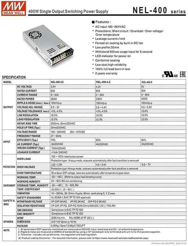 Precise 5V/80A Output & Wide Input Range Delivers a precise 5V/80A high current with adjustable voltage (4.5V-5.5V). Supports a wide input voltage of 180-264VAC to adapt to grid fluctuations