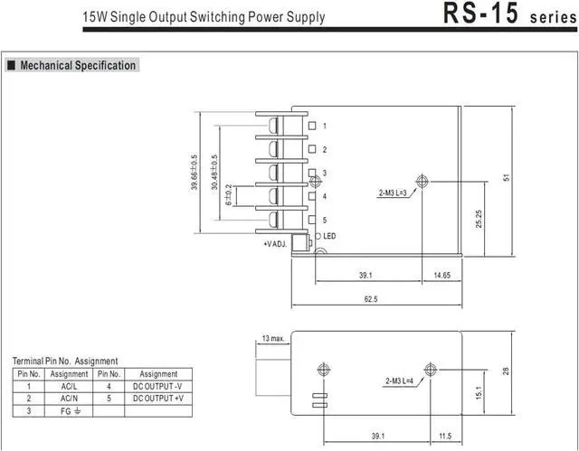 15W Single Output Switching Power Supply AC-DC RS-15-48 48V 0.313A