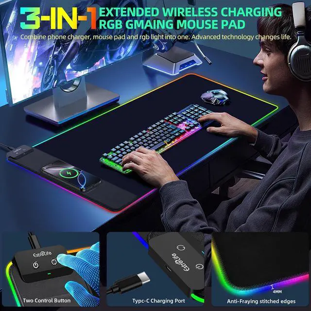 Get the Best Control: ExtreLife extended mouse mat is made of high elasticity natural rubber, this mouse pad with wireless charger is non-toxic and has no hazardous substances, safe for use. Anti-slip base can firmly grip your desktop and nylon stitched edges make the desk pad much more durable and longer lasting. Easily roll up the desk pad without getting wrinkless or creases.