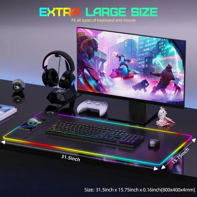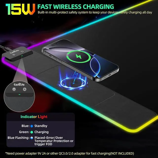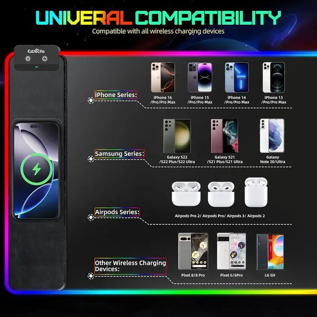 RGB Gaming Mouse Pad with Wireless Charging: This rgb gaming mouse pad is built in 15W fast wireless charging, allowing you to conveniently charge your compatible devices without additional cables cluttering your desk. Compatible with iPhone 16/15/14/13/12/11/X/XR/XS/8 series; Samsung Galaxy S24/S23/S22/S21/S20/S10/S9/S8/Note 9/8 series; Airpods 3rd/ Airpods Pro 2nd/Airpods Pro and other Qi-enabled devices.