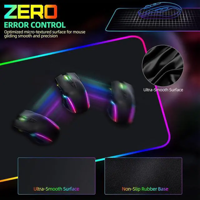 LED backlight mouse pad: Our rgb mouse pad provides 7 static modes and 2 dynamic modes will give you the options you are looking for. Personalize the lighting modes to create a visually stunning gaming experience. RGB desk mat with LED lights adds a touch of style to your gaming or office area. One button controls all light modes, press once to switch light color, double press to flashing light, long press to gradual lighting.