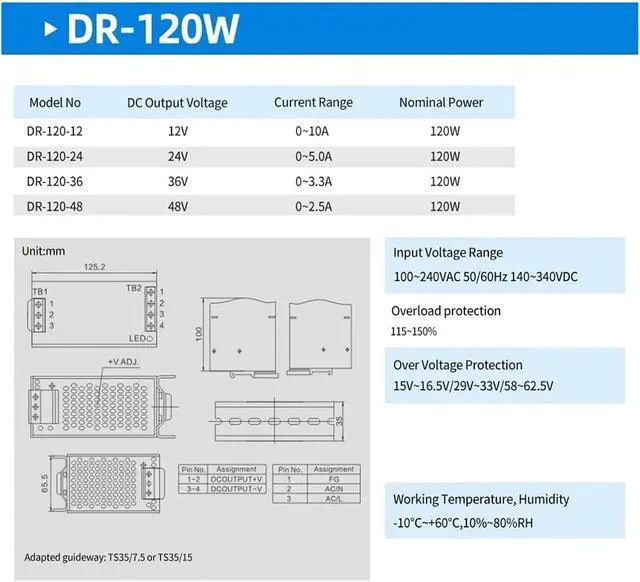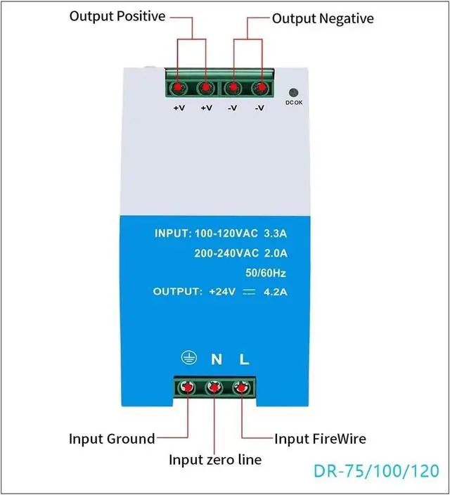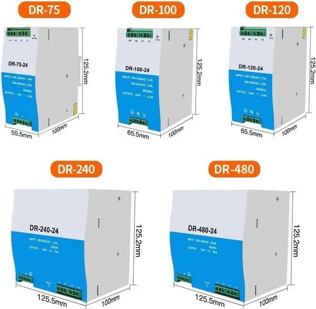 Din-Rail Switching Power Supply Output 12V 24V 36V 48V Power 75W/100W/120W/240W/480W(DR-120,24V)