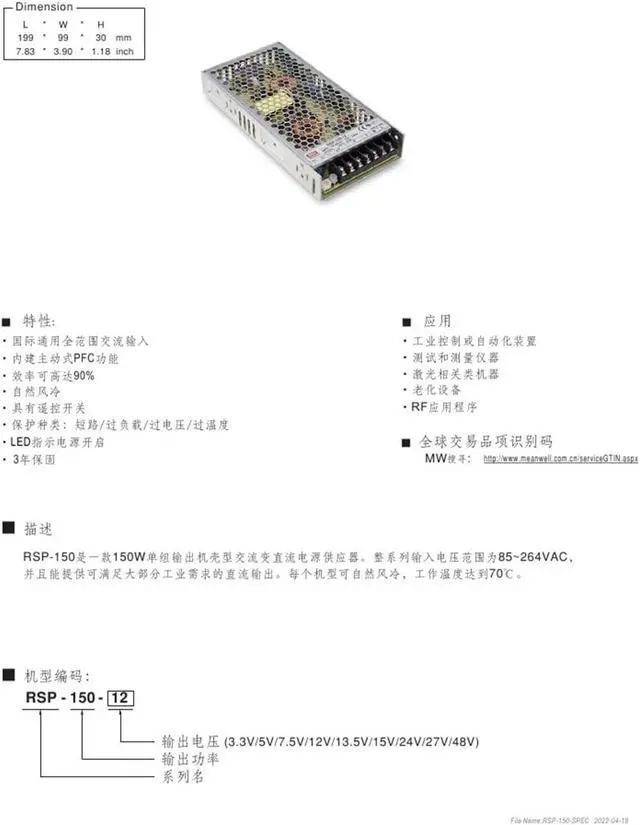 • RSP-150-5 Switching Power supply 150W single output power supply with PFC function