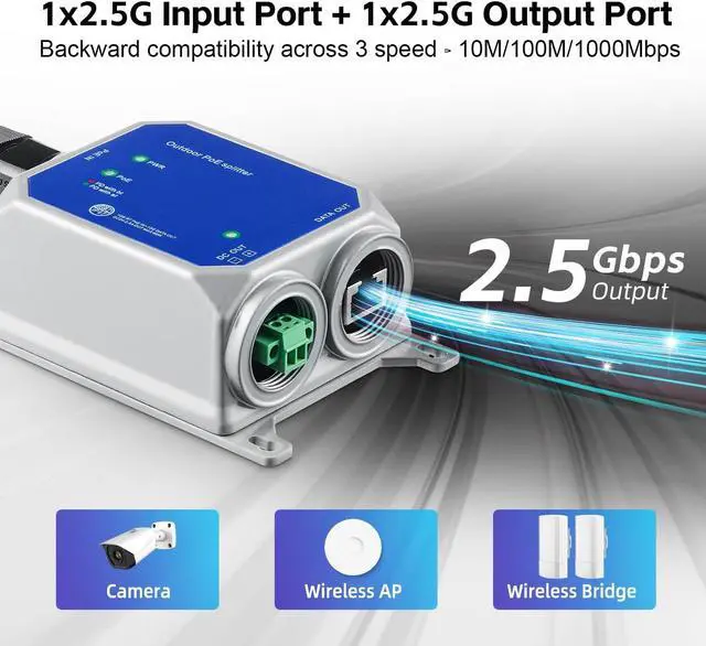 2.5 Gigabit Ports: Include 1 PoE In, 1 data Out, auto adaptive 10/100/1000/2500Mbps speed. 100BASE-TX, Cat5 or later UTP(120 meter); 1000BASE-TX: Cat6 or later UTP(100 meter);2500BASE-TXCat6 or later UTP(90 meter)