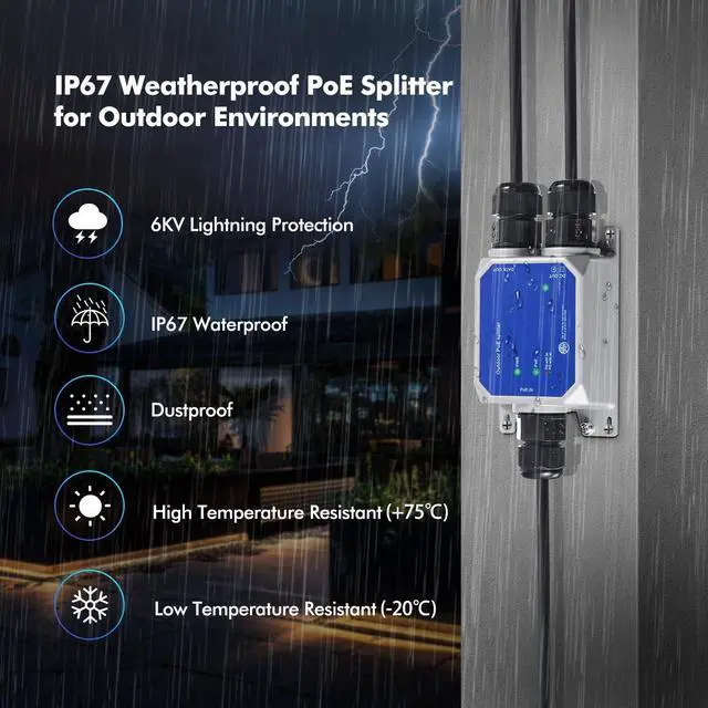 IP67 Outdoor Weatherproof: Rugged industrial grade metal housing, cable interface are all protected in the shell, with waterproof cap, which has better waterproof, dustproof and snowproof effect, and is more suitable for outdoor and indoor environments, such as warehouses, computer rooms, garages, attics, etc. **Pass the network cable through the waterproof cap and then make RJ45 connection**