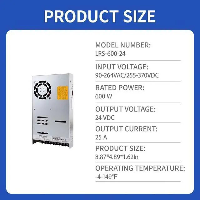 The LRS-600-24 is a 600W single-output switching power supply designed for exceptional reliability in industrial applications.