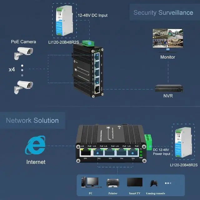 {Industrial 5 Port PoE Switch}: The Industrial 5 ports Ethernet PoE Switch have 5 RJ45 ports 10/100/1000Mbps half/full duplex and also support 12~48V DC Input and boost to 48V output. It will solve the problem that you only have 12V or 24V centralized power supply or solar power supply. And also support Redundant power. {120W Din Rail Power Supply}: The AC/DC 48V DIN Rail Power Supply is a reliable and cost-effective solution for powering a variety of industrial applications. With an output of 48V 2.5A, this device is designed for maximum stability and efficiency. It also offers superior protection with comprehensive protections including PFC, over-voltage protection, over-current protection, and short-circuit protection. {Best choice for you]: Our virtual bundle will provide you with reliable, high-quality performance and convenience. You can Save money by bundling two items together . { Support Din Rail Installation}: Both of Industrial 5 Port PoE Switch and 120W Din Rail Power Supply adopts guide rail installation, user operation is quick, save a lot of time for users. {Powered PoE Switch}: Enjoy the convenience of a powerful Industrial 5 Port Gigabit Ethernet Switch din rail mount.