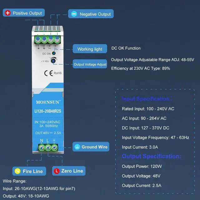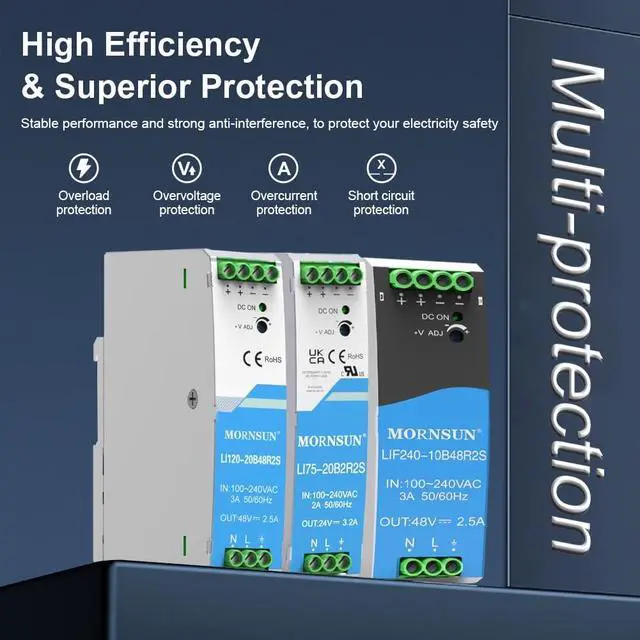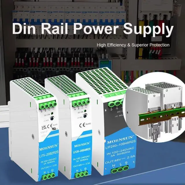 {120W Din Rail Power Supply}: The AC/DC 48V DIN Rail Power Supply is a reliable and cost-effective solution for powering a variety of industrial applications. With an output of 48V 2.5A, this device is designed for maximum stability and efficiency. It also offers superior protection with comprehensive protections including PFC, over-voltage protection, over-current protection, and short-circuit protection.