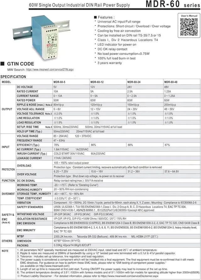 • 1PCS MDR-60 Rail Type 60W Switching Power Supply 5V 12V 24V 48V Small Volume Thin Plastic Housing