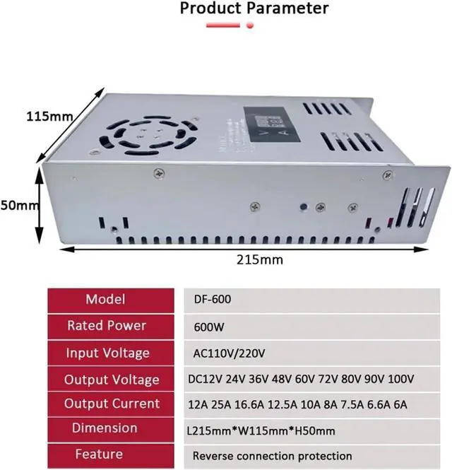 Adjustable DC Power Supply AC110/220V to DC 12/24/36/48/60/72/80/90/100V 600W Industrial Switching Power Supply(12V)