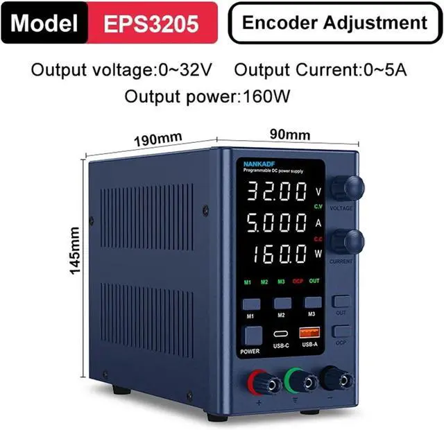1PCS Adjustable Switching Power Supply with 4-Digit LED Display; 5V/3.6A USB/Tape-C Fast Charging with Encoder 3-Group Memory(32V 5A)
