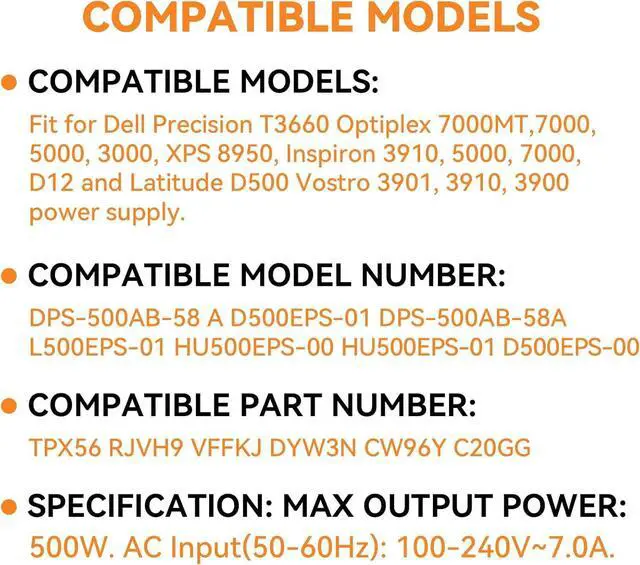 Compatible Models: Fit for Dell Precision T3660 Optiplex 7000MT, 7000, 5000, 3000, XPS 8950, Inspiron 3910, 5000, 7000, D12 and Latitude D500 Vostro 3901, 3910, 3900 power supply.
