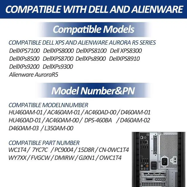 Replacement Model Number: HU460AM-01 Power Supply replaces HU460AD-01, AC460AM-01, AC460AD-00, AC460AM-001, D460AM-01, D460AM-02, D460AM-03, DPS-460DBA, L350AM-00 WC1T4, 7YC7C, PC9004, WY7XX, FVGCW, DM1RW, 15D8R, OWC1T4, GJXN1, CN-0WC1T4