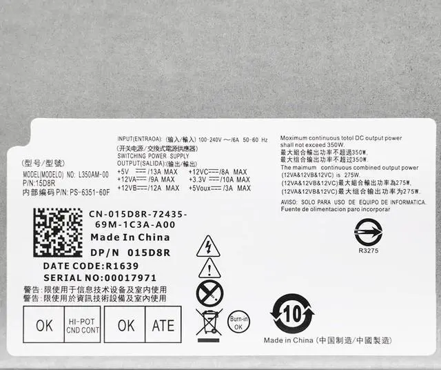 Warranty1* 015D8R 350W power supply. 1 Year warranty. 100% new part and high quality. All motor fans are TESTED rigorously before shipping. For any reason you're not completely satisfied, you can ask for a replacement or full money back.