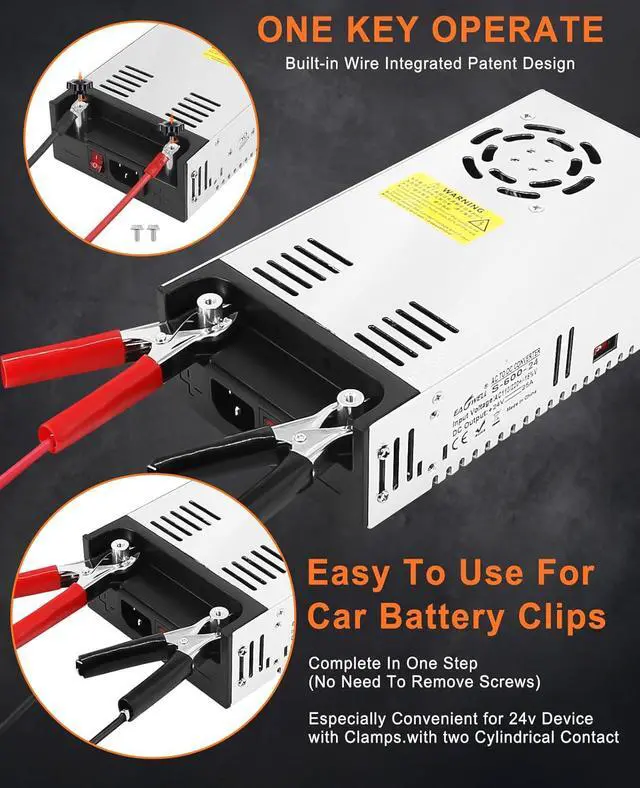 One-Touch Operation and Patent Design: Eagwells US-patented integrated clamp design lets you connect directly to batteries or devices via "+/-" terminals or included battery clipsno extra tools! Perfect for RVs, workshops, and DIY projects
