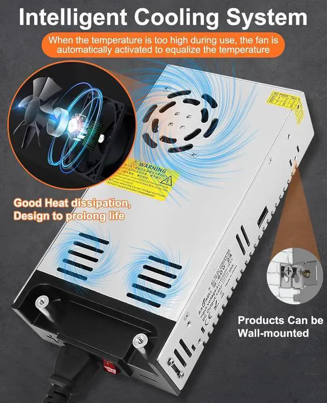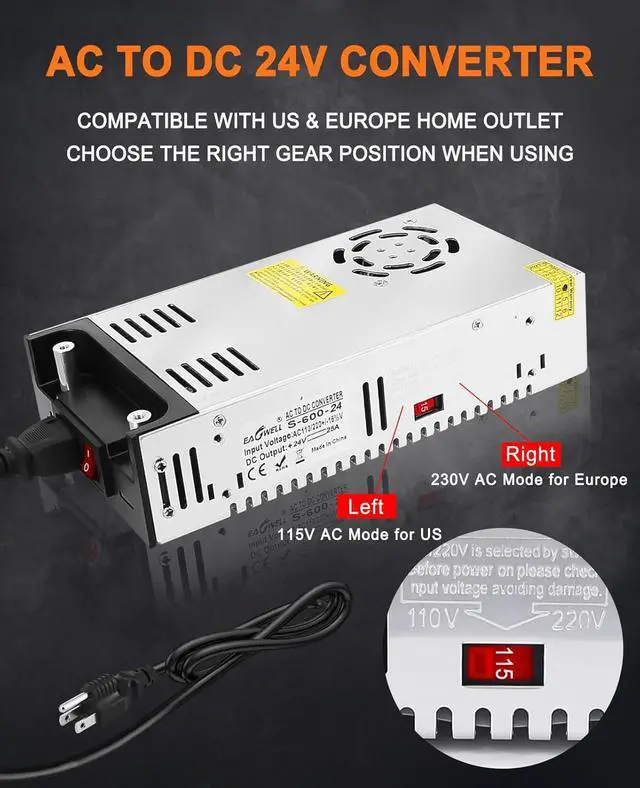 Dual Voltage Input: Supports AC 110V/220V (85-145V / 185-265V) . Delivers stable DC 24V 25A (600W) output, ideal for high-power devices. Peak current: 30A (720W). For resistive device, SMPS peak power device power × 1.25 times. For Motor device, the peak power of the SMPS needs to be more than 2 times the power of the Motor