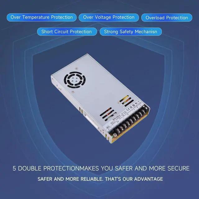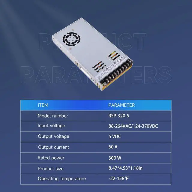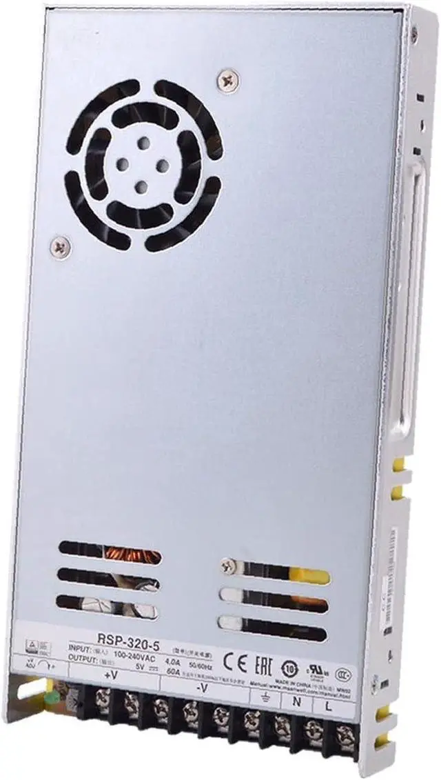 The KCDADA RSP-320-5 is a high-performance 320W single-output AC-DC power supply designed for industrial and commercial use. It delivers a stable 5V output with a maximum current of 60A, adjustable from 4.5V to 5.5V, ensuring flexibility for various devices. With a wide input voltage range of 88-264VAC or 124-370VDC, it operates seamlessly worldwide. The unit incorporates active PFC for improved efficiency, reaching up to 83%, and includes multiple protections such as short circuit, overload, overvoltage, and overtemperature to ensure safe and reliable performance. An internal DC fan provides efficient cooling, supporting operation in temperatures from -22°F to 158°F and altitudes up to 5000 meters. This power supply is certified to meet standards including UL, CE, CB, and EMC, making it suitable for industrial controls, automation systems, test instruments, laser equipment, and RF applications. Its compact dimensions of 8.47 x 4.53 x 1.18 inches and lightweight design facilitate easy integration into various setups. Backed by a 3-year support period, the RSP-320-5 offers dependable power solutions for demanding environments.