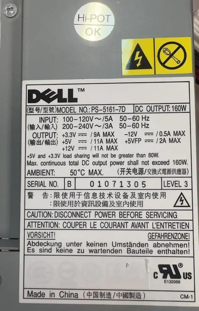 Replaces Dell PSU part numbers: PS-5161-7D, PS-5161-7DS, PS-5161-7DS2, PS-5161-1D1S, P2721, F6442, 3N200, R5953, U5427, P0813, 7E220, and 3Y147.