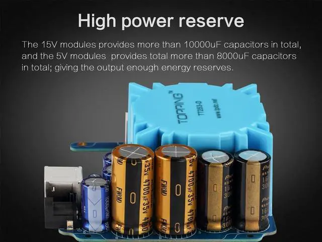The 15V modules provides more than 10000uF capacitors in total and the 5V modules provides total more than 8000uF capacitors in total,giving the output enough energy reserves.