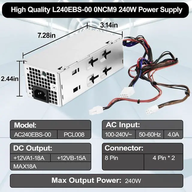 D240EBS-00 Power Supply Replaceable Computer Model Number240W power supply compatible with Dell it can replace AC240EBS-00, L240EBS-00, H240EBS-00, D240EBS-00, DPS-240AB-17A. Note:-Please make sure your computer power supply model is in the list before purchasing, if you are not sure please feel free to contact customersupport for advice