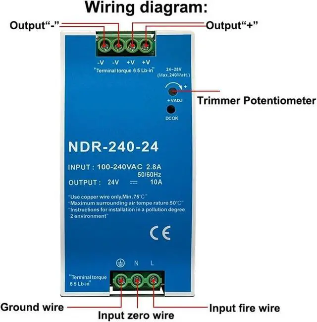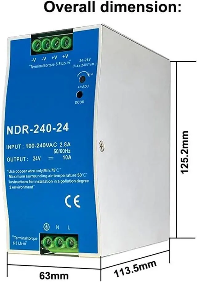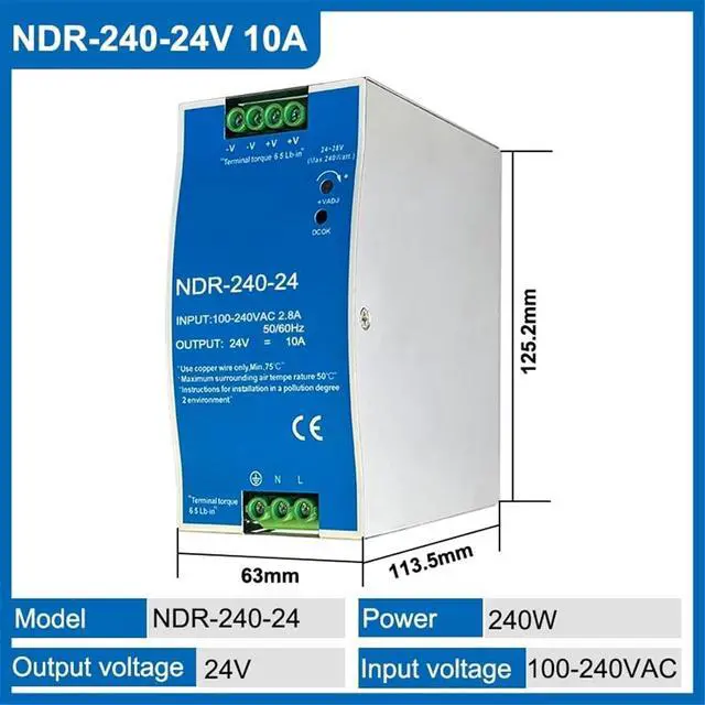 1pcs NDR-75W 120W 240W 480W 12V 24V 48V Switching Power Supply Industrial DIN Rail AC/DC Single Output Power Transformer(NDR-240-24V 10A)