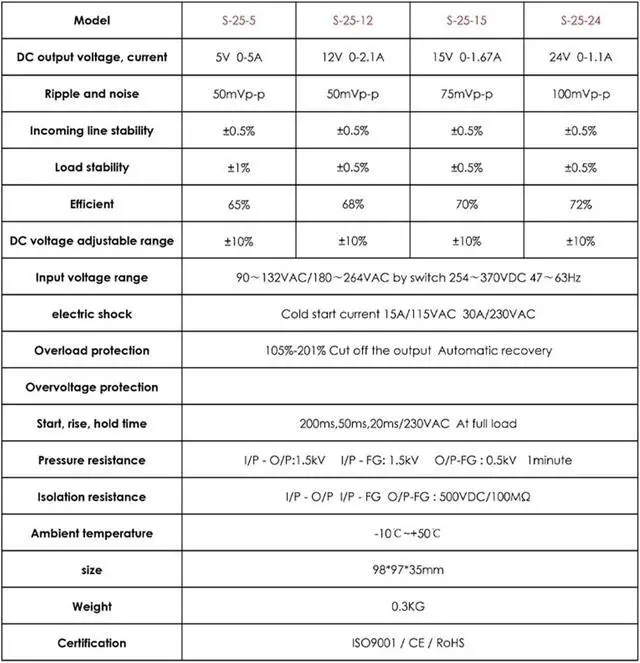 • DC Switching Power Supply Input 25W Output 5/12/15/24 90-132VAC/180-264VAC By Switch 254-370VDC 47-63Hz