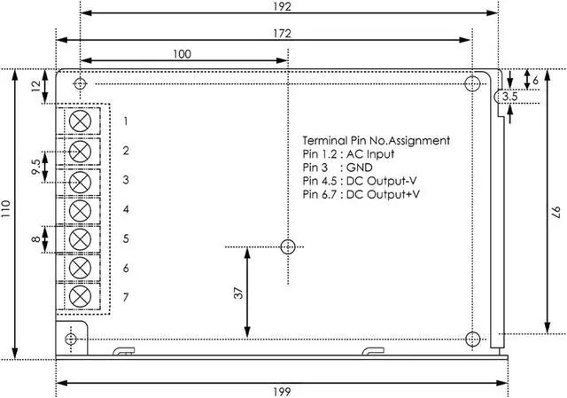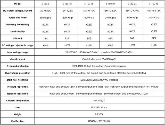 DC Switching Power Supply Input 150W Output 5/12/15/24/36/48v 90-132VAC/180-264VAC by Switch 254-370VDC 47-63Hz(48V)